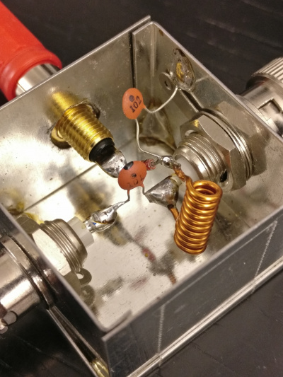 A measurement with my Spectrum Analyzer (with tracking generator) showed that the insertion loss is around 5dB. That's quite a lot, but my expectation is that the LNB will give me a considerable boost so that this loss is not relevant. We will see.