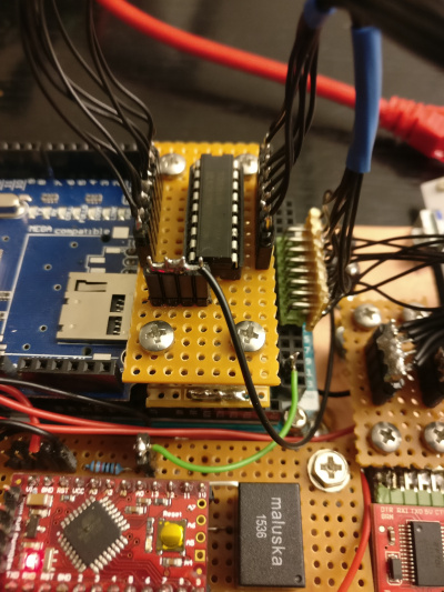 - The LAS2GQ button switch has a LED status indicator ring. The datasheet does not say anything about the LED resistor and its value, which I measured at 960 Ohm. I=U/R tells me that the current will be 52mA, which is above the max ratings of the GPIO pins, so I decided to use a ULN2803AGP Darlington transistor array to reduce the load of the GPIO pins. The ULN datasheet says that the ideal use case would be as emitter switch, so I did that. The eight pins caused a bit of cabling salad, but it works fine :-)